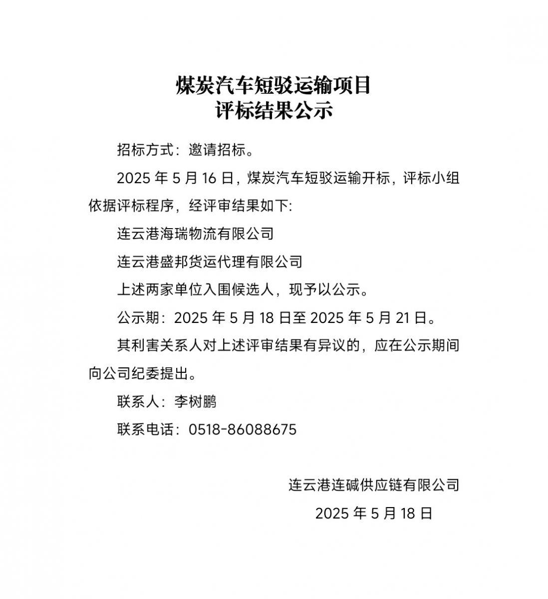 連云港連堿供應(yīng)鏈有限公司煤炭汽車短駁運(yùn)輸項(xiàng)目評標(biāo)結(jié)果公示