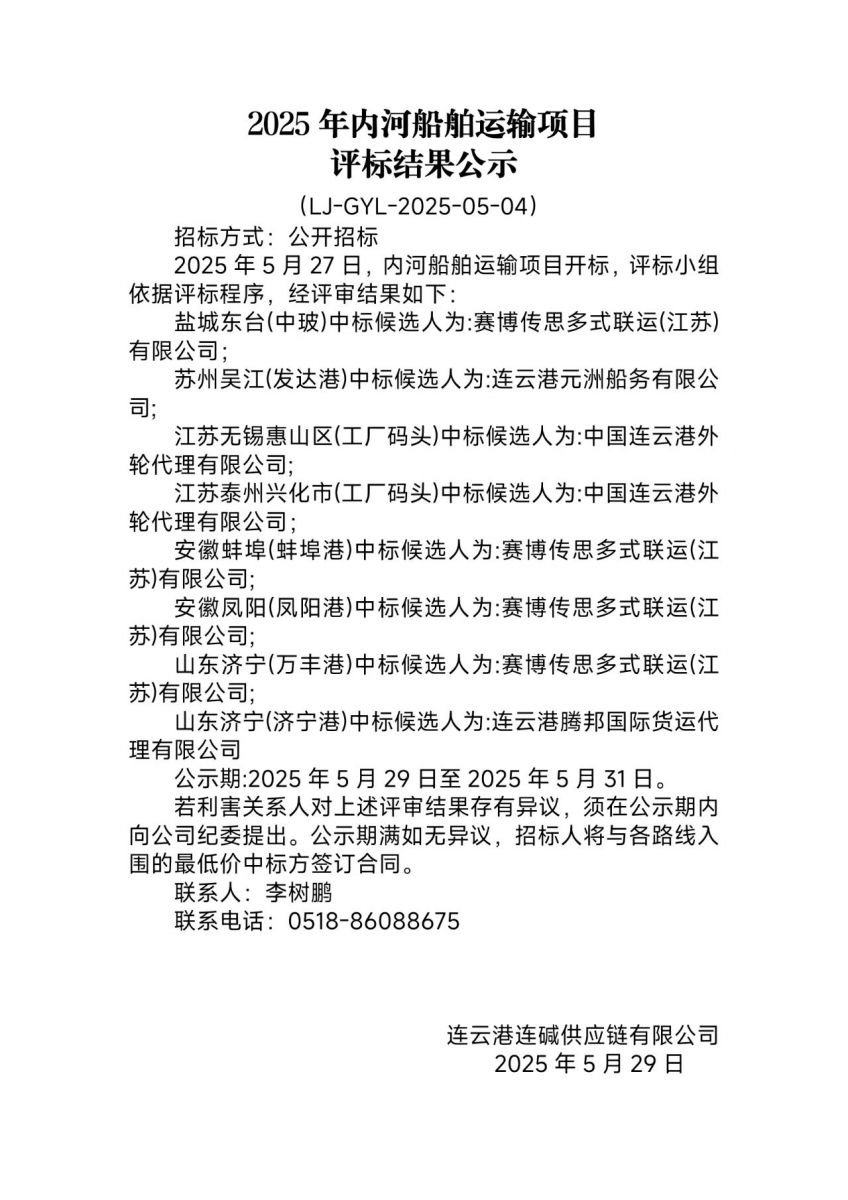 連云港連堿供應(yīng)鏈有限公司2025年內(nèi)河船舶運輸項目評標(biāo)結(jié)果公示