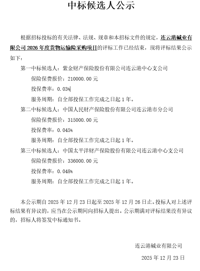 連云港堿業(yè)有限公司2026年度貨物運(yùn)輸險(xiǎn)采購(gòu)項(xiàng)目中標(biāo)候選人公示