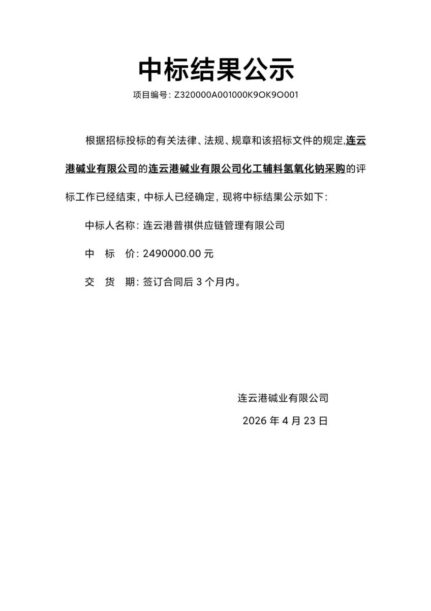 連云港堿業(yè)有限公司化工輔料氫氧化鈉采購中標(biāo)結(jié)果公示