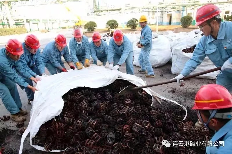 由于清理工作全靠人力完成,崗位人員一邊要維持生產(chǎn),一邊要清理填料,工作量非常大。11月12日下午,公司黨委書記、董事長(zhǎng)張衛(wèi)民在調(diào)研重堿車間生產(chǎn)現(xiàn)場(chǎng)時(shí)了解到這一情況后,當(dāng)機(jī)立斷,立即組織公司領(lǐng)導(dǎo)及各部門黨員干部義務(wù)勞動(dòng),協(xié)助重堿車間完成鮑爾環(huán)填料清理回收工作。