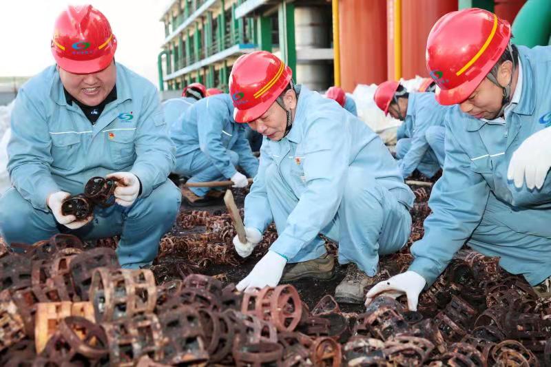 勞動(dòng)現(xiàn)場(chǎng),大家有的用木棍敲打填料,有的裝填包裝袋,有的將裝袋的填料擺放整齊……一個(gè)個(gè)忙得不亦樂(lè)乎。三個(gè)多小時(shí)終于完成了所有填料的清理工作,不僅解決了基層的困難,為蒸餾塔的檢修節(jié)約了時(shí)間,并且共回收可用填料25立方,為企業(yè)節(jié)約了一筆可觀的費(fèi)用。