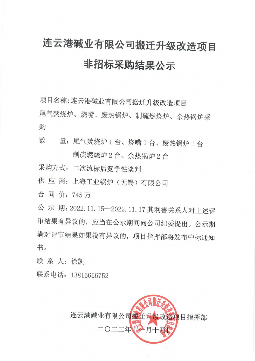 尾氣焚燒爐等設(shè)備非招標采購結(jié)果公示