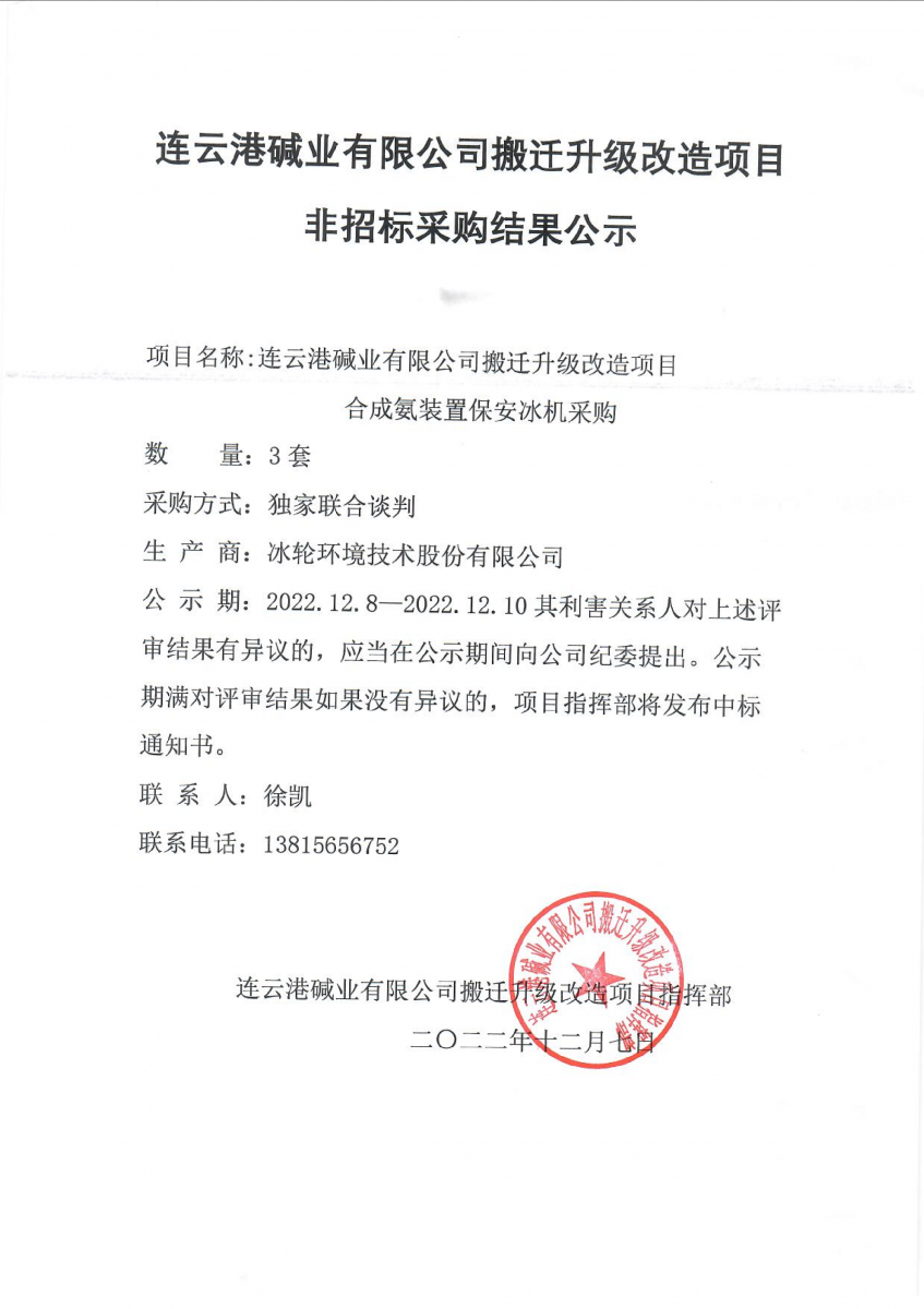 合成氨裝置保安冰機非招標(biāo)采購結(jié)果公示