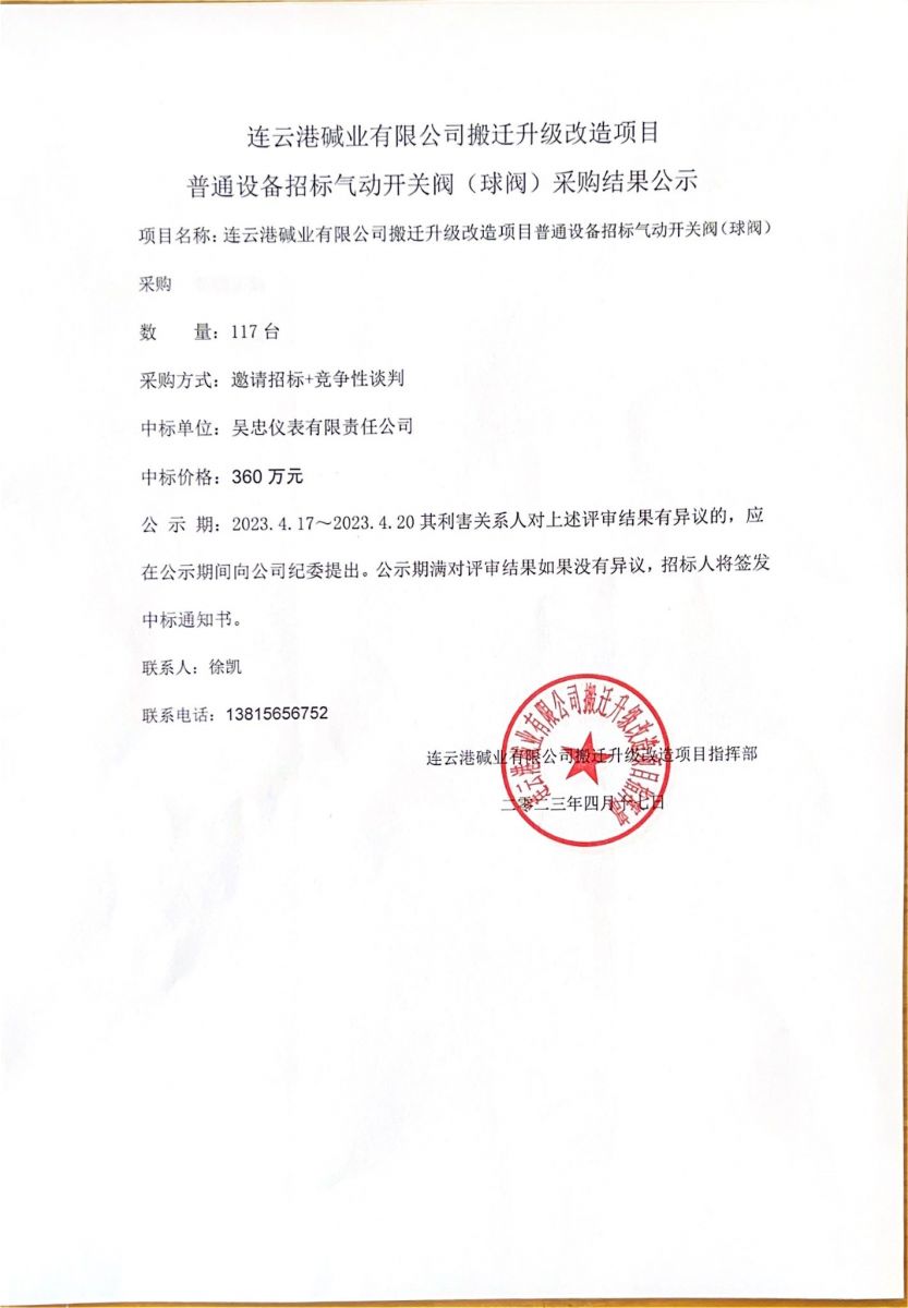 氣動(dòng)開關(guān)閥(球閥)采購結(jié)果公示