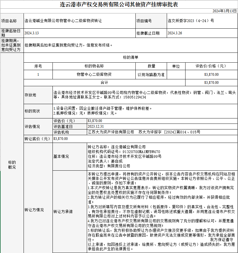 連云港堿業(yè)有限公司物管中心二級(jí)庫物資轉(zhuǎn)讓公告