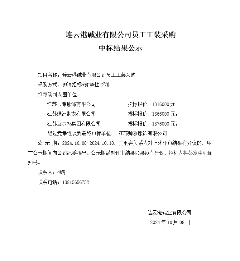 連云港堿業(yè)有限公司員工工裝采購(gòu)中標(biāo)結(jié)果公示
