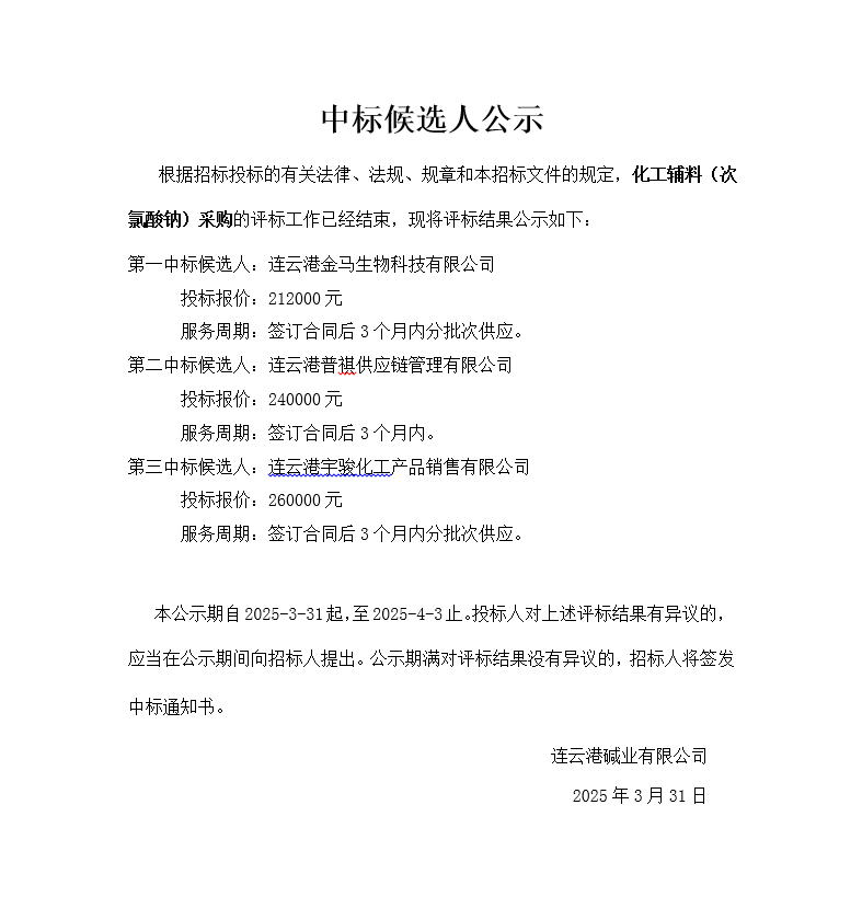 化工輔料次氯酸鈉采購(gòu)中標(biāo)候選人公示