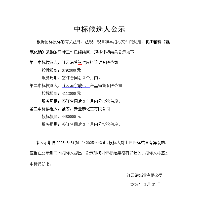 化工輔料氫氧化鈉采購中標候選人公示